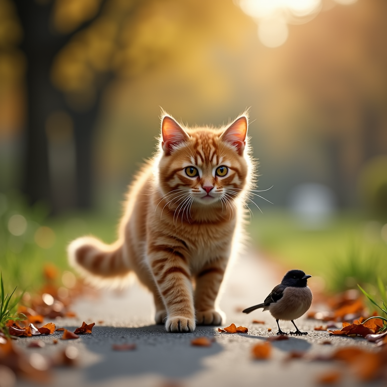 В волшебной стране, где солнце слепило глаза, а небо резало их синевой, жили кот и птица. Кот грелся на солнечной полянке, а птица парила над ней. Однажды кот заметил птицу, сидящую на ветке, и был поражён. Обычно птицы его боялись, но эта была смелой и любопытной. Подойдя ближе, они начали общаться, открывая друг другу удивительный мир. Чем закончилась их встреча? Расскажите, о чём кот и птица говорили друг с другом.