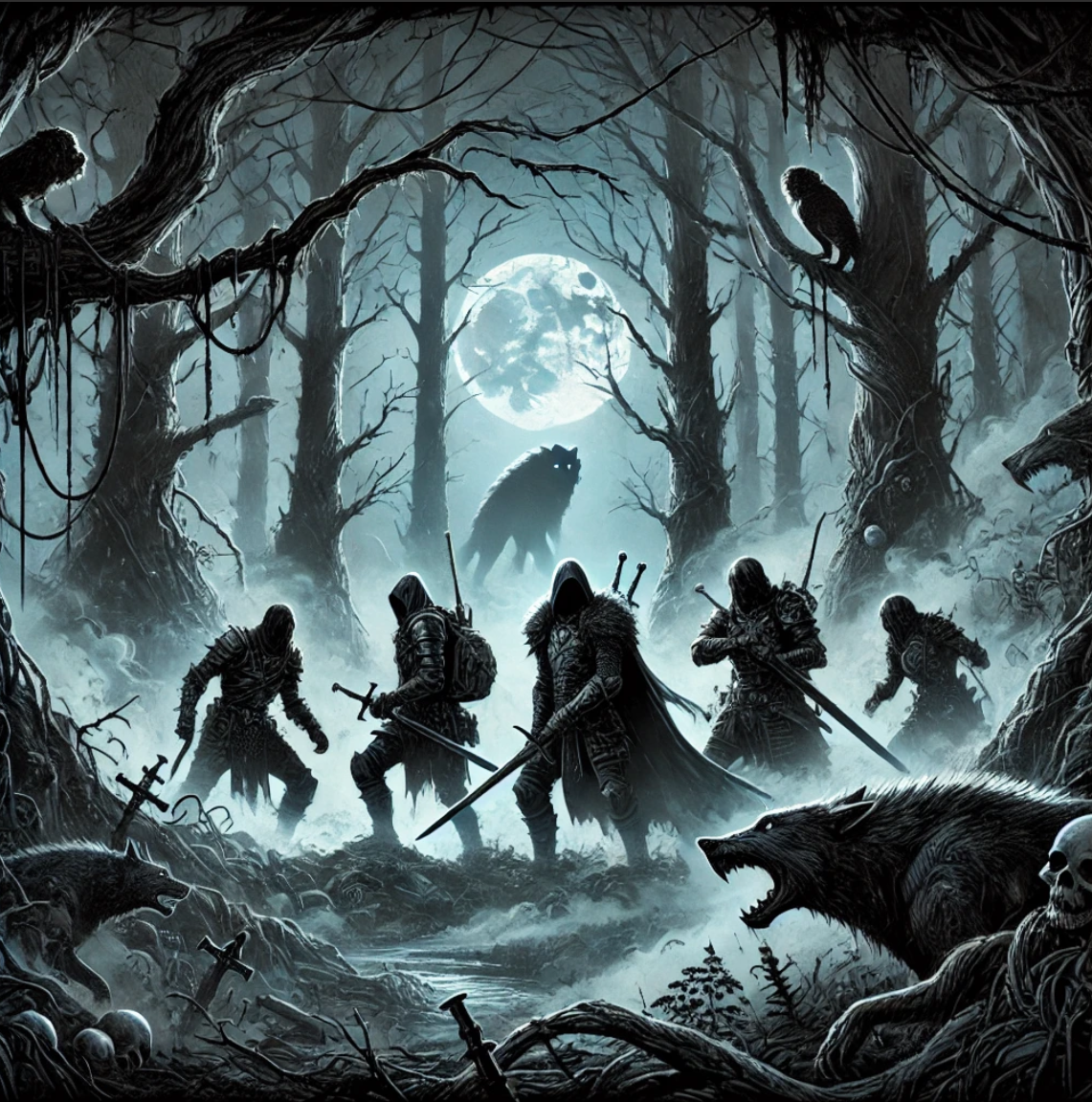 Небо было затянуто тяжёлыми свинцовыми тучами, и блеклый лунный свет еле пробивался через плотную пелену. В небольшой деревушке, где раньше кипела жизнь, стояла тревожная тишина. Именно сюда спешил отряд из пятерых наёмников — Ройс, Доральд, Аррена, Гюнтер и Хельмут. Их наняли в большой спешке: барон требовал найти и уничтожить зверя, предположительно оборотня. По слухам, он уже не раз показывал свою жестокую сущность. Но никто не ожидал, сколь кровавым окажется след монстра.