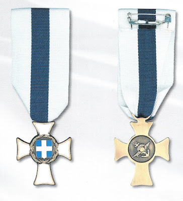 Медаль имеет форму креста, залитого белой эмалью. На лицевой стороне по центру – эмблема государственного герба Греческой Республики. На оборотной стороне – эмблема Генерального штаба Национальной Обороны. Присуждается военнослужащим при жизни или посмертно во всех случаях за исключительные деяния, вплоть до самопожертвования, которые были совершены в мирное время. Награждения производятся за исключительные действия, не связанные обязательно с военной ситуацией, и которые были совершены в рамках своих обязанностей или выходя за них, к случаям достойным награждения относятся следующие поступки: - за акт самопожертвования; - смерть при несчастном случае, при исполнении своих обязанностей; - тяжелое ранение как результат действий или несчастного случая произошедших в рамках исполнения данным лицом своих обязанностей; - очевидный исключительный поступок, многократно превышающий исполнение своих обязанностей, и вызывающий неизменное восхищение и высокую оценку вышестоящим руководством и по