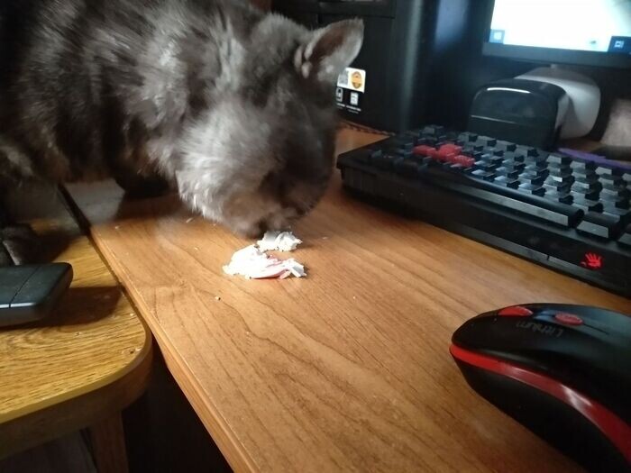 Я продолжаю своих любимцев переводить на натуральный корм. Дурман от сухого корма постепенно из них выходит. Я сама для них готовлю еду, которую они стали принимать. Конечно без хитрости, манипуляций, поощрений не обошлось. Иногда я задумываюсь: - кто кого дрессирует, я их или они меня? Наверное друг друга:) Боцман уже когда видит что я иду с весами, ложкой, тарелочкой и пакетом из-под вискаса (Вискаса там нет, другая "вкусняшка") он бежит за мной и взлетает на мой рабочий стол, кушает сначала мясо с кашей и только когда все съест он получает вознаграждение в виде тех самых вкусняшек из пакета вискаса. А вот с Настенькой пока еще сложно, но уже есть маленький прогресс, она все так же прячется сначала под кровать, а потом через время вылазит и я ее кормлю. Ест она пока с ложки, самостоятельно слизывая предложенную пищу. Из тарелочки не хочет. Наверное тарелочка не нравится, вероятно придется купить другую с мышками например:) А сегодня сидя за своим рабочим столом и кушая крабовые палоч