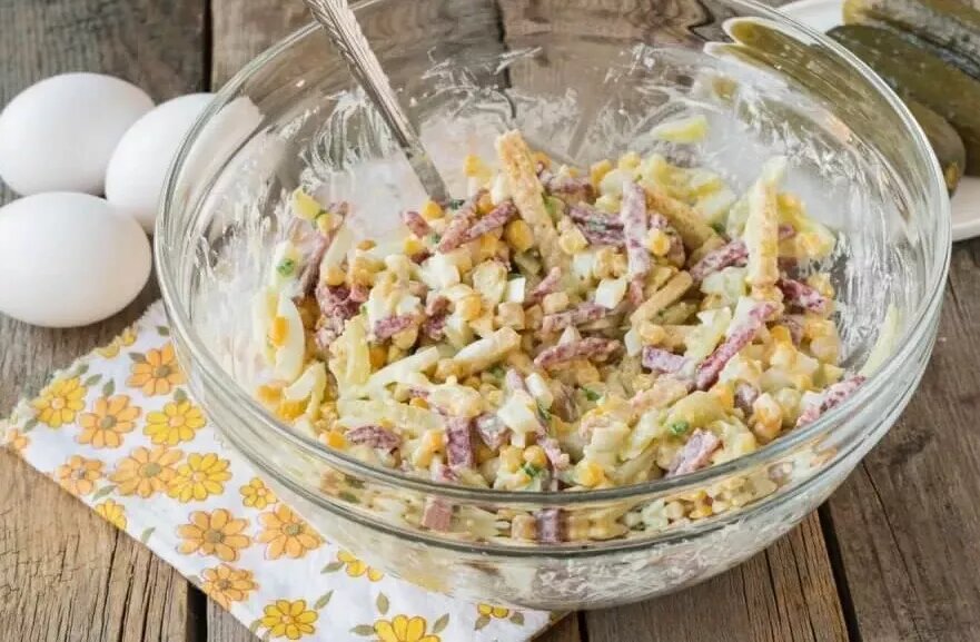 Колбаса копченая — 120 г;яйца — 4 шт.;сыр твердый — 120 г;кукуруза консервированная — 150 г;чеснок — 1 зубчик;майонез — 90 г.