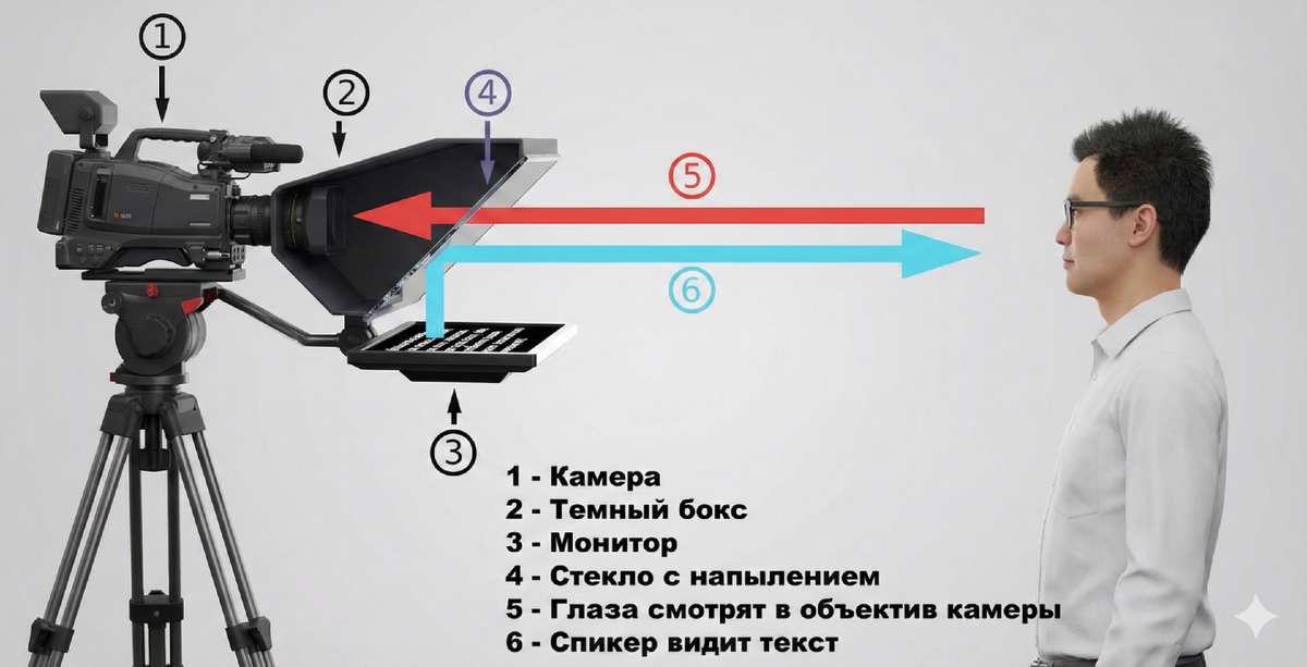 Телесуфлёр работает по принципу отражения: текст отображается на стеклянной поверхности перед объективом камеры, а выступающий видит его через зеркало. Зрители не могут видеть текст на экране.Тексты сценариев, речей и других материалов передаются на телесуфлёр, чтобы выступающий мог прочитать их перед камерой. Это оборудование широко используется при записи новостных программ, политических выступлений, корпоративных видеороликов и других видеоматериалов, где важно прочитать текст, не отвлекаясь от контакта с аудиторией.