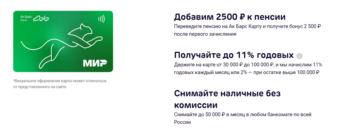 Выход на пенсию – это новый этап жизни, когда появляется больше времени для себя, своих увлечений и близких. Чтобы этот период был максимально комфортным и беззаботным, важно иметь надежные инструменты для управления финансами. Дебетовая карта «Забота» от банка Ак Барс – это именно то, что нужно активным пенсионерам, ценящим удобство и выгоду. Ак Барс Карта с кешбэком 5% на аптеки при получении пенсии на карту с Коробкой. Добавим 2500 ₽ к пенсии. Переведите пенсию на Ак Барс Карту и получите бонус 2 500 ₽ к первому зачислению. Получайте до 11% годовых. Держите на карте от 30 000 ₽ до 100 000 ₽, и мы начислим 11% годовых каждый месяц или 2% — при остатке выше 100 000 ₽
