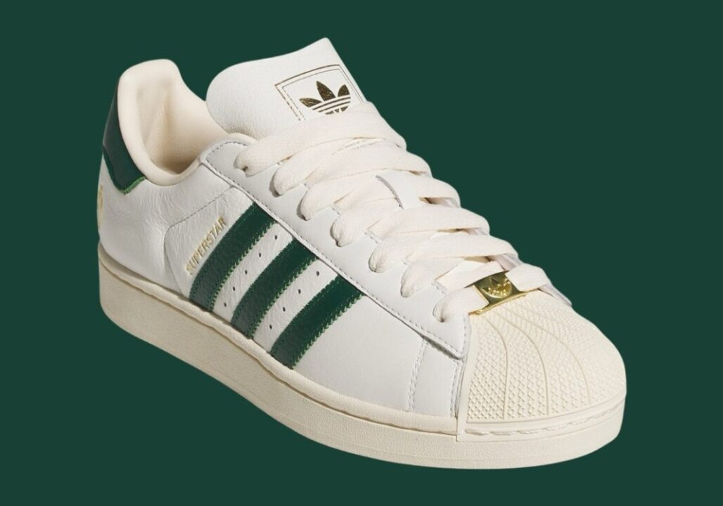 Верхняя часть этих Superstar выполнена из почти белой кожи, дополненной яркими зелеными полосками и соответствующими накладками на пятке. Золотистые акценты в виде фирменного брендинга на боках, язычке и заднике акцентируют внимание на дизайне. На правой пятке изображен знаменитый логотип Лилларда «D dollar», а на левой – графика часов «Dame Time».