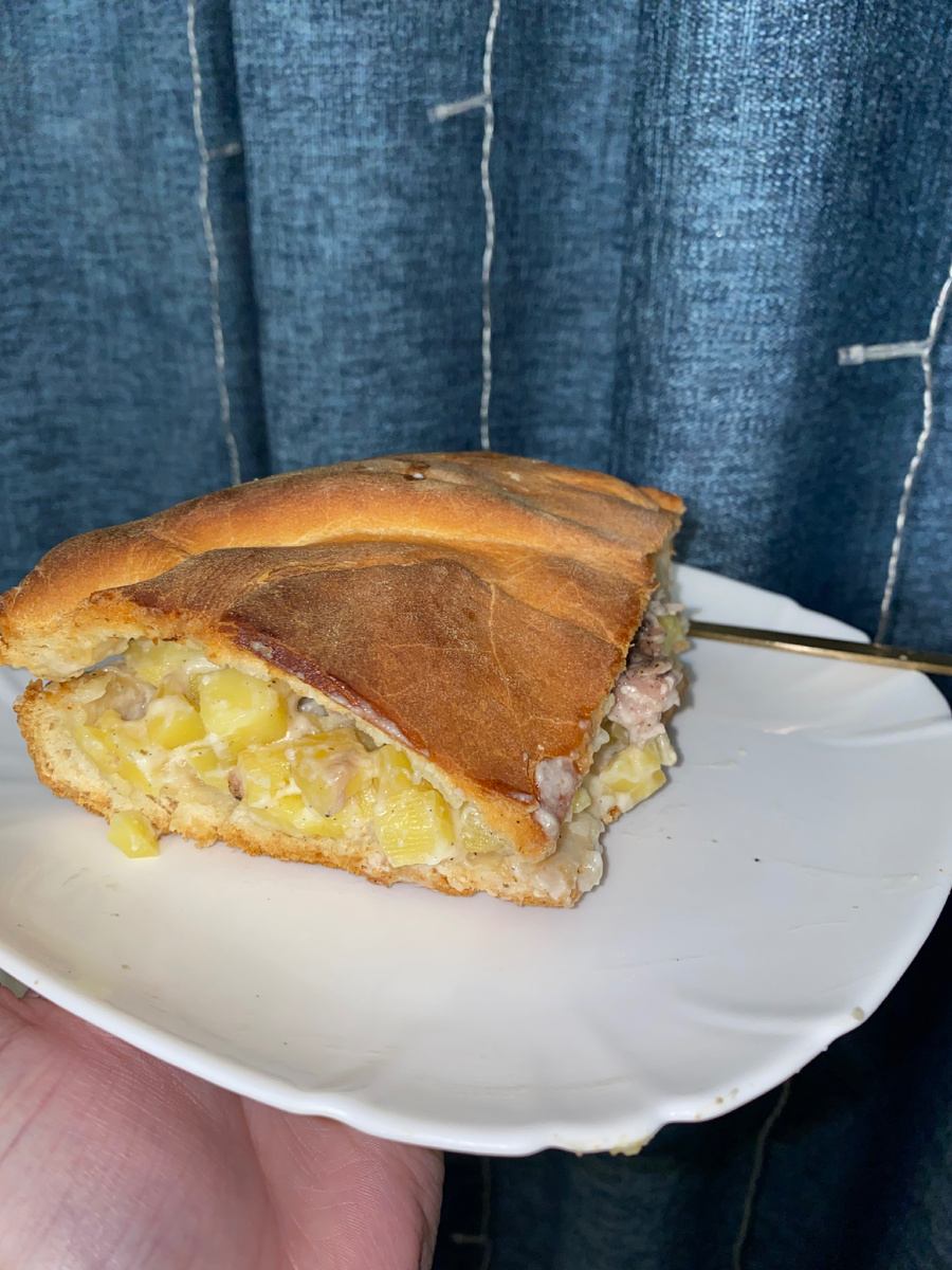 - Разделяем тесто на 2 неравные части. Большую часть раскатываем в круг и перемещаем на противень, покрытый пекарской бумагой. На тесто, отступая от края, выкладываем начинку слоями: картофель, лук, мясо. (Если мясо сухое, то добавьте пару ложек масла растительного или кусочки сливочного.)