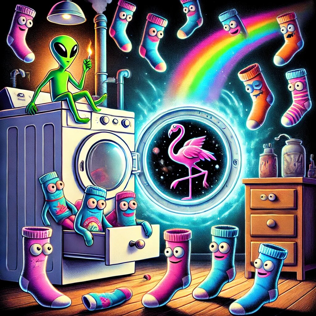 Вы никогда не задумывались, куда пропадают носки после стирки? 🤔 Вот кладёшь их в стиральную машину парой, а достаёшь... сироту. 🧦 Одиночку. Носок, потерявший смысл жизни. Скажете, глупости? А вот я не уверен. Тут явно замешано что-то большее. Началось это всё с того, что я обнаружил: моя коллекция носков начала исчезать прямо у меня на глазах. 😟 😟 Причём исключительно по левым экземплярам. Спрашивается: зачем миру только левые соксы? Они что, уходят на митинг? Решил провести эксперимент. Взял два ярких носка — с фламинго и кактусами. Сунул в машину. Стиралка загудела, запела, как всегда, а когда я открыл её... фламинго исчезли. Только кактусы остались. И тут я понял: это война! Теория №1: стиральная машина — это портал в другой мир Представьте: где-то сейчас инопланетянин надевает мой носок с фламинго, чтобы выглядеть на межгалактической вечеринке модным?! Носки просто телепортируются в параллельную реальность, где они, что становятся чем-то важным? Например, валютой. Представьте