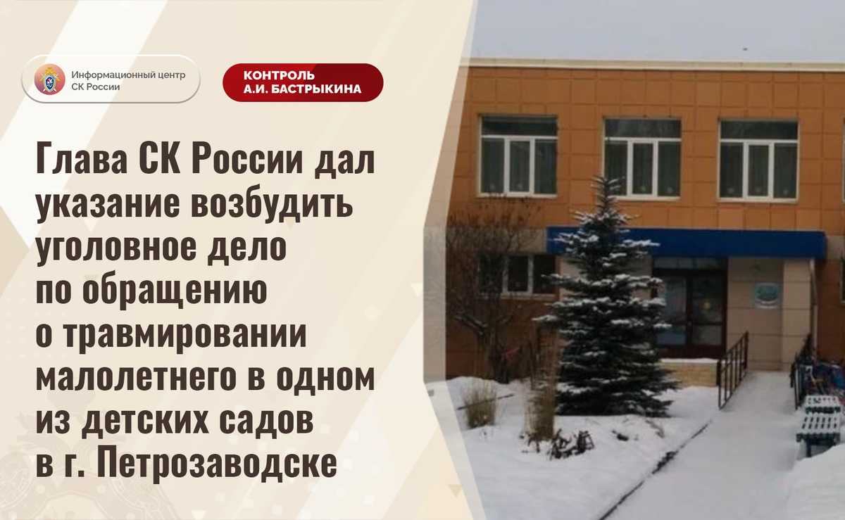 Глава СК России дал указание возбудить уголовное дело по обращению о травмировании малолетнего в одном из детских садов в г. Петрозаводске В комментариях в аккаунте приёмной Председателя СК России А.И. Бастрыкина «ВКонтакте» обратилась жительница Республики Карелии по вопросу травмирования ее двухлетнего сына в детском саду в городе Петрозаводске, в результате которого он стал инвалидом. В сентябре 2023 года из-за отсутствия одного из воспитателей на рабочем месте мальчик остался без присмотра и употребил техническую жидкость для посудомоечной машины. С полученными химическими ожогами полости рта, пищевода и желудка ребенок был госпитализирован, ему потребовалось длительное стационарное лечение. По мнению заявительницы, инцидент произошел по вине руководства дошкольного учреждения, поскольку заведующая не привлекла к работе другого воспитателя, а также приняла меры к сокрытию следов на месте происшествия. Указанная ситуация освещалась в СМИ. В производстве СУ СК России по Республике Ка