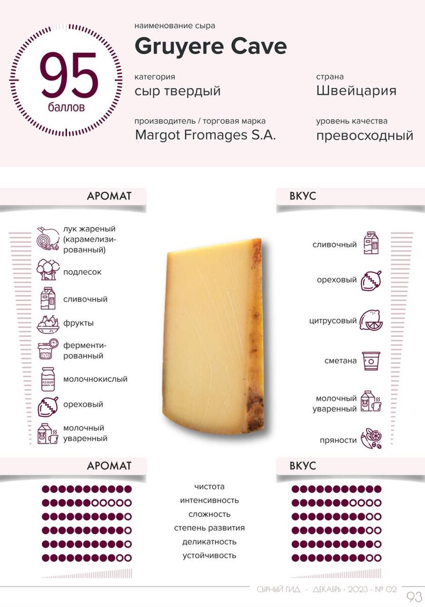 Для детального разбора органолептики были выбраны 3 швейцарских сыра от производителя Margot Fromages S.A. - твердые Gruyere Cave, Emmentaler, Granbir. Все 3 сыра можно найти на витринах не только специализированных сырных лавок, но и крупных сетевых супермаркетов. Сыр отличного качества, со сложным и деликатным ароматическим и вкусовым профилями, с отличным балансом во вкусе. Несмотря на наличие остроты во вкусе, она очень хорошо вписывается во вкусовой профиль, не нарушая баланс. Отличный образец для сырной тарелки и дополнения холодных блюд с сохранением ароматики сыра. Интересный образец сыра со сложным и интенсивным ароматическим профилем и хорошим балансом во вкусе. Сыр со сложной ароматикой и вкусом, с выбивающейся горчинкой, нарушающей баланс, что может быть недостатком головы сыра (необходима повторная дегустация другой