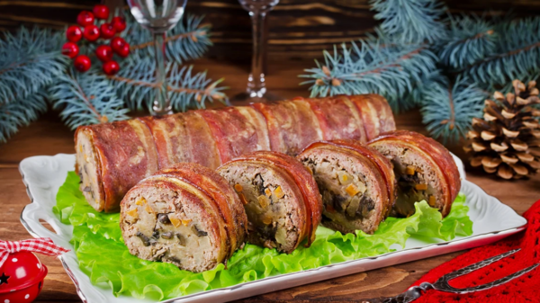 Пригласим гостей да поедим от души, но сначала запечем в беконе рулет из фарша индейки начиненный картофельным пюре с жареными шампиньонами!