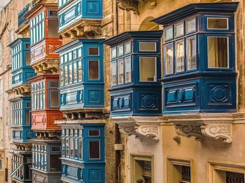 Балконы - это мальтийская "фишка", её изюминка. На выбор, в основном, красные и синие. Кому какие? Практической ценности для меня в этих балконах нет: я никогда не курил и с 35-ти лет, к сожалению, трудоголик, "крутящийся до упаду" без возможности стоять на каком-то балконе... Но эти балконы являются несомненой доминантой любой из мальтийских улиц, и их яркие цвета на фоне песчаных стен сразу бросаются в глаза. Найти нечто подобное можно разве что в Испании или Португалии. Гораздо больше сходства у красочных, резных, разукрашенных мальтийских балконов с арабскими или ближневостчными домами. Традиция Мальты делать балконы деревянными, крытыми, резными и богато разукрашенными, как и на востоке, идет к установившимся стереотипам зажиточности и обеспеченности. На Мальте очень мало деревьев и много камня. Лесов вообще нет. Поэтому семья, имевшая достаток, старалась построить легкий балкон-веранду из дерева, показывая тем самым свой статус без дополнительных объяснений, мол, у них достаточн