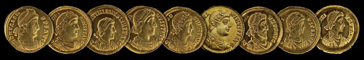 На монетных дисках можно увидеть изображения восьми императоров, включая непризнанного императора Евгения, который правил всего два года.