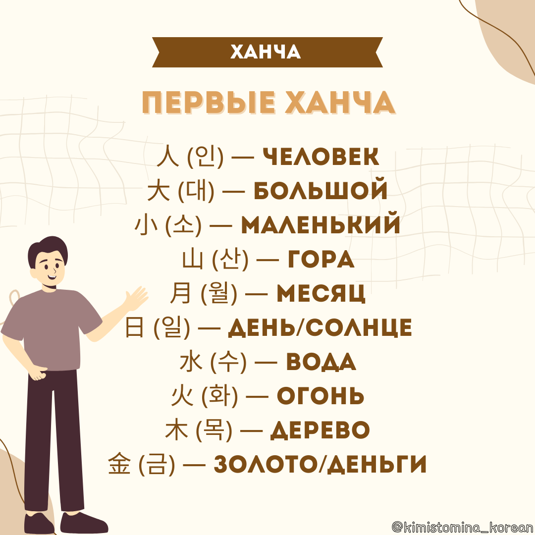 👩🏫Готовы начать учить ханча? Давайте начнём с десяти самых базовых и часто используемых символов. Вот они: 人 (인) — человек 大 (대) — большой 小 (소) — маленький 山 (산) — гора 月 (월) — месяц 日 (일) — день/солнце 水 (수) — вода 火 (화) — огонь 木 (목) — дерево 金 (금) — золото/деньги Запомните их написание, значение и произношение. Эти символы встречаются в корейском языке очень часто, и они помогут вам лучше понимать окружающий мир и язык. ✨Попробуйте выучить эти 10 ханча за неделю! Каждый день учите по два символа и пишите их в комментариях — вместе будет легче. #репетитор #репетиторпокорейскому #корейскийязык #корейский #Корея #репетиторство #репетиторкорейскийязык #репетиторонлайн