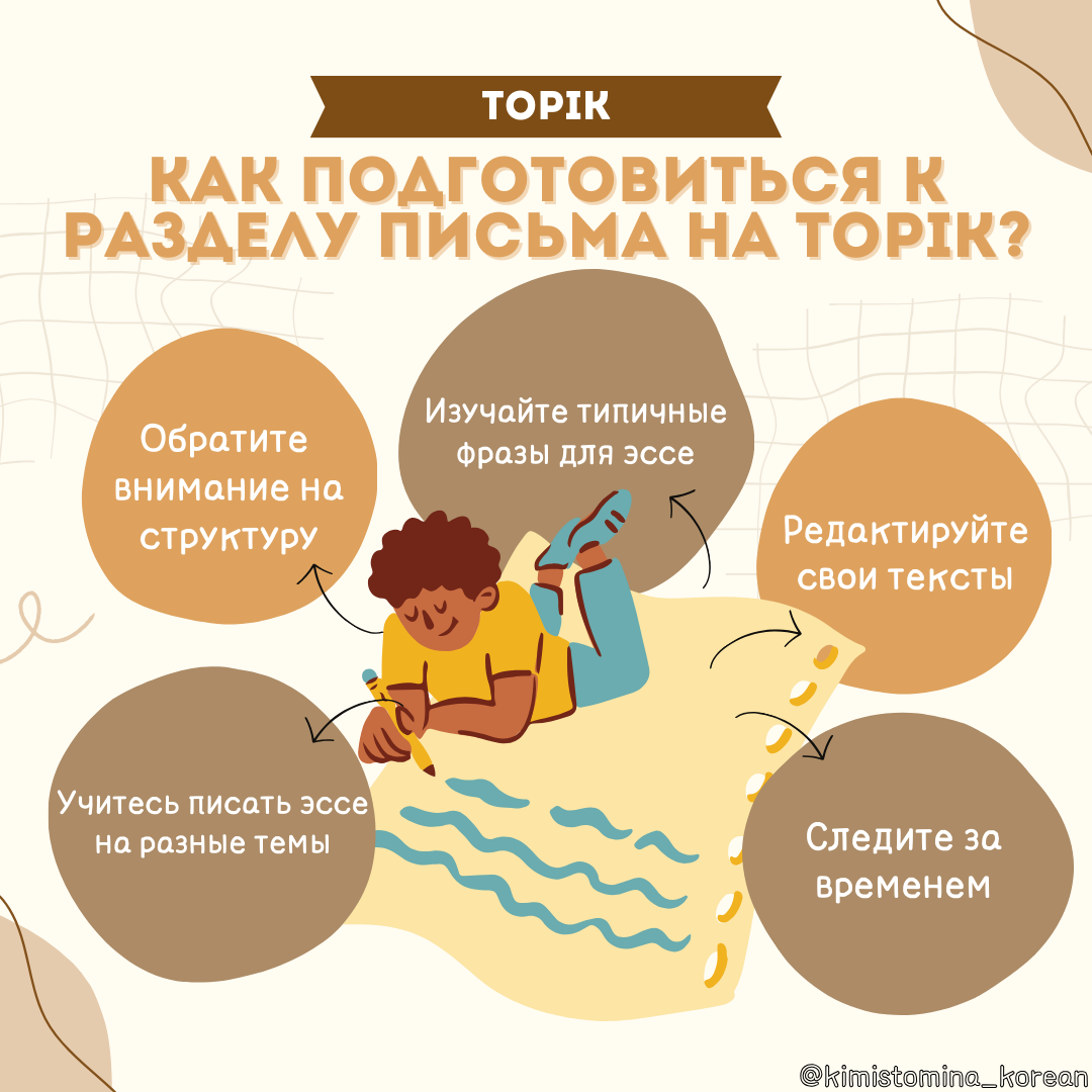 Письменный раздел на TOPIK II — это один из самых сложных аспектов экзамена, требующий не только грамматической правильности, но и умения логично и последовательно излагать мысли. 📝Вот как вы можете подготовиться: - Учитесь писать эссе на разные темы. На экзамене вам могут предложить любые темы: от технологий до экологии. Практикуйтесь писать краткие эссе на корейском языке по широкому кругу тем. - Обратите внимание на структуру. Ваше эссе должно быть логичным и последовательным. Начинайте с введения, затем изложите основные аргументы и завершите выводом. - Изучайте типичные фразы для эссе. Существуют определённые выражения, которые помогают сделать вашу письменную речь более формальной и связной. Например: 1. 첫째로 (Во-первых) 2. 둘째로 (Во-вторых) 3. 결론적으로 (В заключение) - Редактируйте свои тексты. После того как вы напишите эссе, перечитайте его и исправьте ошибки. Попросите носителя языка или преподавателя проверить ваше письмо. Следите за временем. На экзамене у вас будет ог