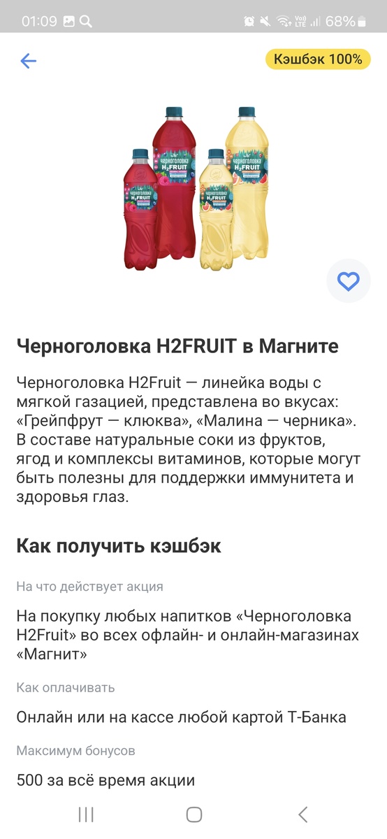 Я с утреца к вам с хорошей новостью! Т-банк вновь предлагает нам 100% кэш. На сей раз на напитки (воду с соком) Черноголовка. Я такую ещё не пробовала, поэтому с удовольствием поучаствую! Покупку надо совершить в Магазине "Магнит", причём хоть онлайн, хоть оффлайн. Главное - не забыть потом добавить чек в приложении Т-банка. Удивительно, но возвращают аж 500 руб.! Значит можно взять несколько бутылок, если, конечно, они ещё будут в магазине😊 И, да, не забудьте вступить в Клуб лояльности Черноголовка там же в приложении Т-банка, тогда и ещё кэш будет, если я правильно понимаю😊 Всем отличного, бодрого дня!💪🤗🌷 Дополняю статью. Нашла! Купили на 2 карты! Еле дотащили🙈🤪😁 Самое смешное, что лимонады я не пью😁 За все кэш уже начислен и не 100%, а ещё больше😁, потому что вступила в Клуб лояльности Черноголовки! В общем, не просто бесплатно напитки получили, а ещё и немного заработали🤗