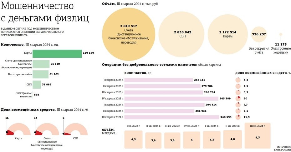 В пояснительной записке к законопроекту авторы предполагаемых ограничений ссылаются на стремление оградить граждан от финансовых потерь из–за действий мошенников. По оценке ЦБ РФ, в июле–сентябре 2024 года зафиксировано 349 тыс. операций без добровольного согласия клиентов на 9,3 млрд рублей. Из них возвращено заёмщикам всего 12%, или 1,1 млрд. В апреле–июне инцидентов было 257 тыс. на 4,8 млрд, возмещено не более 291 млн. Налицо — резкий рост хищений.