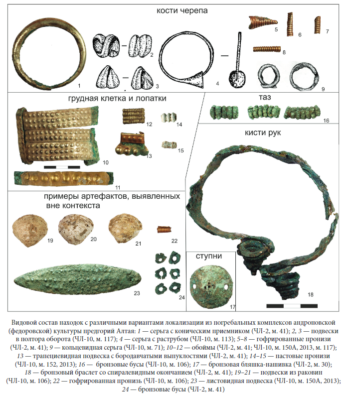 Для точного отнесения предметов к тому или иному элементу одежды требуется наличие органических остатков, которые могли бы служить прямыми доказательствами их использования в погребальном костюме. Однако органические материалы, такие как ткани и кожа, крайне редко сохраняются в погребальных комплексах эпохи бронзы Алтая. В связи с этим мы вынуждены лишь использовать информацию о расположении предметов относительно скелета погребенного. Такой подход принят в научной литературе, где аналогичным образом интерпретируются археологические данные из синхронных [4, с. 109–116; 5, с. 15–17], а также более поздних [17, с. 59–68] культурных комплексов. Так, предметы, обнаруженные в районе черепа погребенного, соотносятся с головным убранством; выявленные в районе верхней части грудной клетки и лопаток — с нашейными украшениями и декором наплечной одежды (оплечьями); зафиксированные в районе тазовых костей с наборными поясами, ремнями и опоясками — декором наплечной и поясной одежды; в районе ног и ступней — с поясной одеждой и обувью.