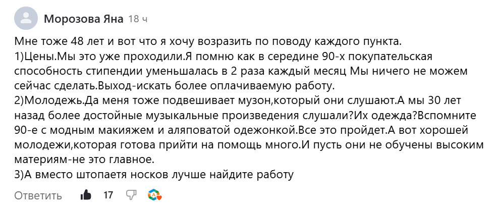 Вчера написала статью и на меня как из ушата вылилось столько негатива. Ну да ладно. Я стараюсь пролистывать злые комментарии, чтобы негатив не прилип ко мне, а остался с тем, кто его написал. Мне пишут: идите работать, найдите работу! Но я не хочу вставать рано утром и идти по морозу или проливному дождю, ветру до автобусной остановки. Не хочу толкаться в маршрутке и тратить нервы на нерадивого начальника. Хватит. В свое время я наработалась и натерпелась на всю жизнь. У меня стаж 15 лет и пенсионные баллы накопились, чтобы получать минимальную пенсию. А работать в интернете планирую пока видят глаза и руки по клавишам стучат. А еще мне пишут, что я пишу с ошибками. А сами не замечают своих. В комментариях мне написали, что у меня нет работы, которая приносит большой доход. Ну хорошо. Давайте посмотрим, сколько получает в моем городе учитель рисования и черчения. На hh. ру нет таких вакансий. А учитель начальных классов получает 35 000 руб. Вы серьезно? Я в интернете примерно в 2 р