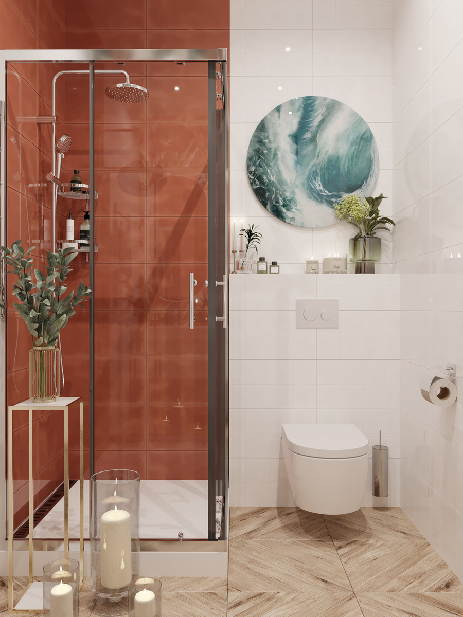 Так как заказчики данного санузла любят путешествовать, я решила привнести ещё больше красок в их жизнь, чтобы каждое утро яркая акцентная плитка зажигала их на позитивное настроение. Пока создавала данный дизайн, сама представляла как я бы заряжалась положительной энергией такими насыщенными цветами.