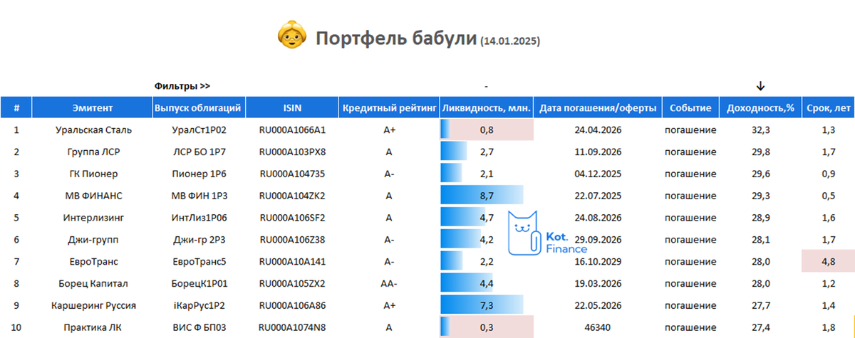 Диверсифицированный, доходный, надежный, и максимально простой портфель. Бабуля одобряет!🤟 Мы придумали портфель бабули, чтобы предлагать простые и надежные решения, не требующие много времени. Кредитный рейтинг А- и выше – золотая середина (компромисс) между риском и доходностью. Правила портфеля просты: · Без оферт, потому что бабуля может пропустить их · Высокая надежность (А- и выше), потому что толерантность к риску низкая · Высокая диверсификация, и в то же время не навязчивость с количеством выпусков, чтобы число корпоративных действий, реинвестирования, и прочего – не напрягало · Высокая ликвидность (легко купить/легко продать) Портфель бабули не предполагает ребалансировку, ведь главное правило - максимально простой портфель. Но мы эксперименитируем с ребалансом в другом проекте ✅Что мы выбрали:• Уральская сталь 🆕 • ЛСР• Пионер • М.Видео• Интерлизинг • Джи Групп• Евротранс 🆕 • Борец 🆕 • Делимобиль • Практика ЛК 🆕🆕- изменения относительно прошлого выпуска Самой концентрир