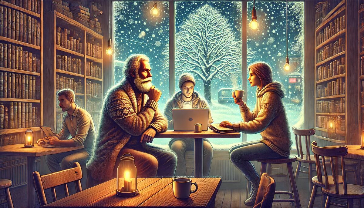 Заснеженный городской пейзаж за окном уютной кофейни. Внутри у окна сидят профессор философии Александр Иванович, его ученица София и программист Игорь. Они обсуждают главу "Вещество сознания" из книги Ричарда Онианса, задаваясь вопросами о природе сознания и его субстанции. София: (листает книгу) Вот здесь, в "Веществе сознания", Онианс говорит, что древние представляли тюмос как "пар или дыхание". Это немного странно — как что-то нематериальное может быть "веществом"? Александр Иванович: Это как раз не так уж странно, если подумать о древнем восприятии мира. Для эллинов вещество и дух не разделялись так резко, как в наше время. Помнишь, Гомер описывает, как тюмос покидает тело в момент смерти, словно испаряющийся пар? Это вещество, но тонкое. Игорь: (смотрит вдумчиво) Получается, что для них сознание имело физическое проявление? С современной точки зрения, это звучит как попытка объяснить нейронные импульсы или что-то в этом духе. Александр Иванович: Верно. Греки воспринимали жизнь к