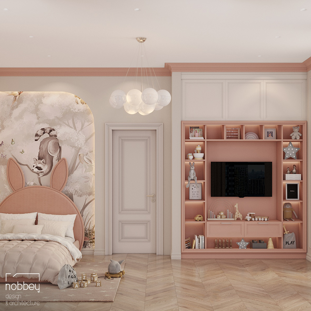 Делимся подборкой интерьеров комнат девочек, в которых показываем решения, предложенные Nobbey с учетом геометрии пространства, возраста, характера детей. Во всех решениях для детских мы стремимся выдержать баланс, планируя с «запасом» место сна, рабочую зону и системы хранения. В комнате выделены две основные зоны: место сна для девочки и «гостиная» с диваном и ТV — для просмотра мультиков и чтения с няней. В этом интерьере акцентами выступают решения, которые актуальны только в детстве: кровать с мягким изголовьем в виде зайца, фреска с изображениями сказочного леса, при этом их легко заменить. Правильная форма и четыре окна, одно из которых угловое, — светлое пространство, где будет организовано рабочее место, когда оно потребуется. Сейчас приоритетным желанием родителей было максимально освободить пространство для игр, поэтому наполнение комнаты сделали минимальным и функциональным. Для интерьера выбрана теплая пастельная палитра. Рабочее место с шкафчиками, полками и выдвижными ящ