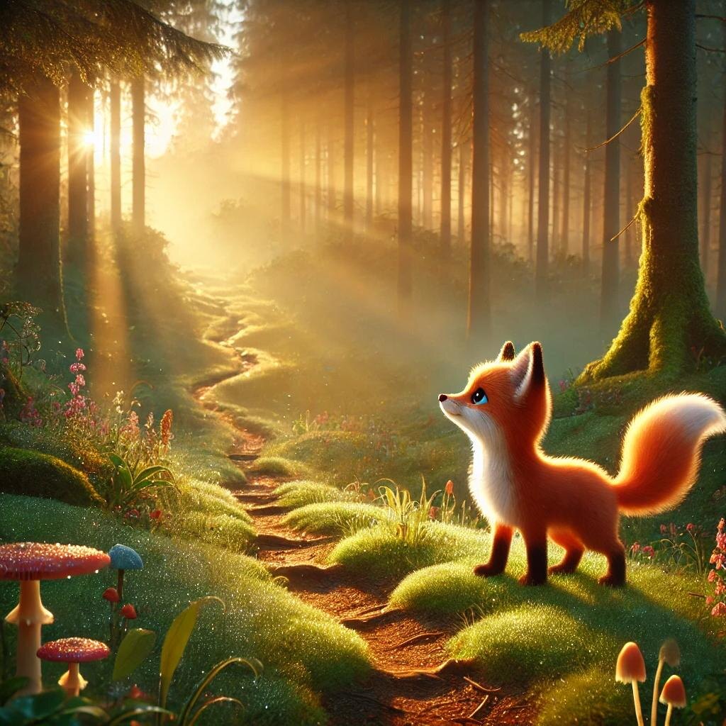 Рано утром в зелёном лесу, где солнце осторожно пробивалось сквозь густую листву деревьев, жила маленькая Лисичка по имени Лили. Её шёрстка была ярко-рыжей, словно вечерний закат, а хвостик – пушистым, с белым кончиком, который играл на солнце, как снежинка.