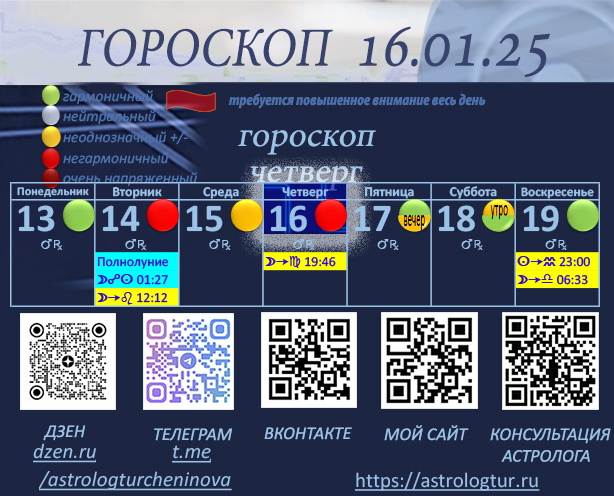 Сегодня кульминация напряженного аспекта между Солнцем и Марсом, который будет ощущаться до 18 января. Этот конфликтный и травматичный аспект требует от нас особой осторожности. Важно соблюдать правила безопасности и избегать конфликтов, чтобы не усугубить ситуацию. Возможные события под влиянием этого аспекта: - Конкуренция и желание проявить себя могут привести к конфликтам, особенно в профессиональной среде. Мы можем столкнуться с ситуациями, когда наши амбиции пересекаются с интересами других. - Возможность проявления лидерских качеств будет присутствовать, но с риском чрезмерной агрессии или доминирования. - Ощущение внутреннего напряжения и раздражительности может сказаться на отношениях с близкими и коллегами. - Возможны споры или столкновения из-за различий в мнениях или подходах. - Риск импульсивных действий или решений может привести к негативным последствиям, включая травмы. Мы должны быть особенно внимательны к своим действиям и избегать необдуманных поступков. Помимо эт