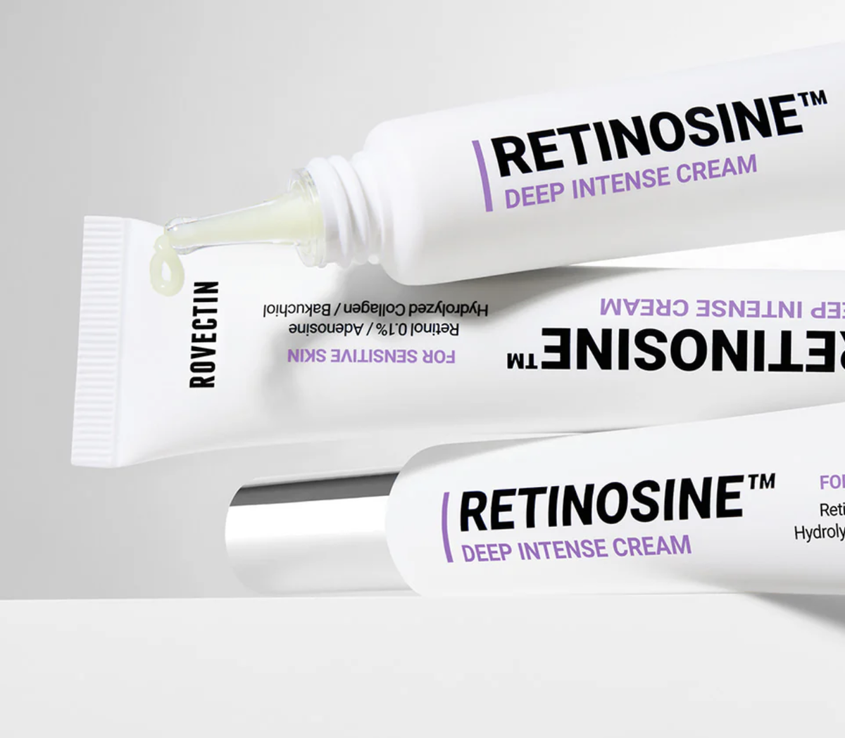 ✔ Обновляет кожу — выравнивает тон и текстуру, убирая следы постакне. 1. Rovectin Retinosine Deep Intense Cream 🔹 0,1% ретинола — безопасная концентрация для первых шагов.