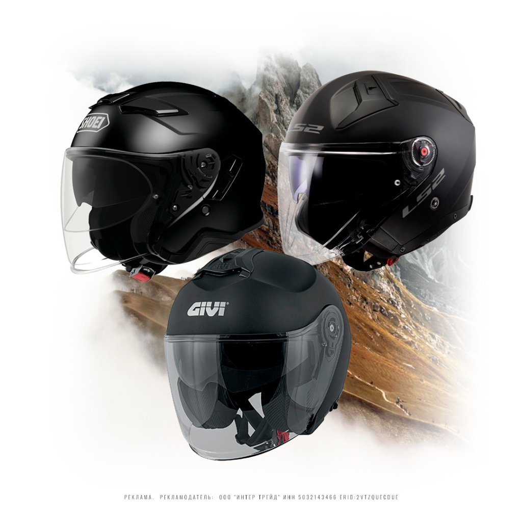 Открытый шлем с длинным стеклом хорош для жаркой погоды, но если вдруг пойдёт дождь, то в нём не придётся останавливаться и пережидать его – в закрытом виде на стекло изнутри капли дождя не попадают, видимость сквозь него не нарушается. А ещё этот тип шлема подходит к мототехнике абсолютно любого класса – в таком на чём угодно будет уместно ездить.