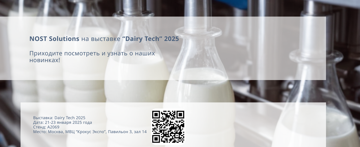 Уважаемые клиенты! Рады сообщить вам, что познакомиться с нашей продукцией, увидеть ее вживую и задать нам интересующие вас вопросы, вы сможете на выставке Dairy Tech 2025, которая состоится 21-23 января по адресу: Москва, МВЦ “Крокус Экспо”, Павильон 3, зал 14. На выставке мы представим оборудование, подходящее молочной промышленности: Мы будем рады видеть вас на нашем стенде под номером А2069. С уважением, Команда «НОСТ-Солюшенс»