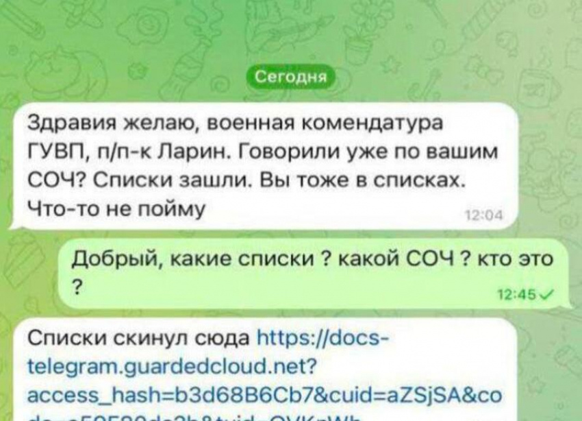 Военнослужащим Российской армии начали отправлять подозрительные сообщения. Один из наших читателей поделился фотографией странного сообщения, накануне пришедшего его родственнику, который на данный момент проходит службу по контракту в зоне СВО. В сообщении якобы военная комендатура указала, что пополнила список новыми бойцами и направили военнослужащему, чтобы тот ознакомился. - Здравия желаю, военная комендатура ГУВП, п/п-к Ларин. Говорили уже по вашим СОЧ? Списки зашли. Вы тоже в списках, что-то не пойму, - было указано в сообщении бойцу СВО. Однако вместо ссылки на документ, родственнику нашего читателя отправили фишинговую ссылку при открытии, которой злоумышленник может завладеть чужими личными данными. К счастью, русский военнослужащий понял, что ссылка содержит подозрительные символы и не стал переходить по ней. Стоит напомнить, что не стоит переходить по ссылкам, полученным от неизвестных отправителей. При открытии подобных ссылок вы можете остаться пострадавшим в такой ситуа