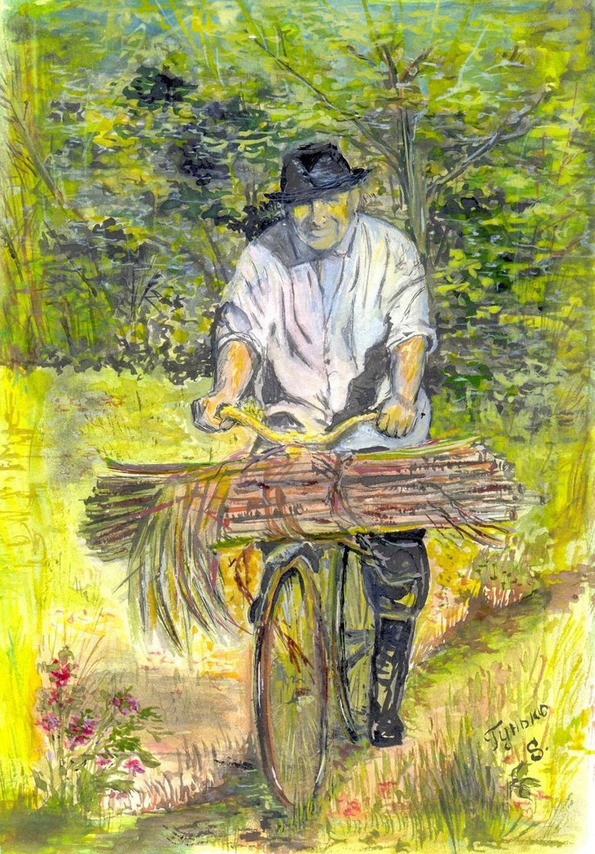 «Ты шо, не умиишь на раме?» -удивилась Дуся. Велосипед у деда был крепкий, известной фирмы «Wanderer», скорее всего, это был трофейный велосипед с большим кожаным седлом и блестящим звоночком. Дед был довольно грузный мужчина высокого роста, но велосипедом управлял виртуозно и сидел на нем как влитой. В то же время Василий Миронович пользовался велосипедом, словно трактором. Чего только он не привозил на своем любимце: и связки толстых веток дерева, и мешки с рыбой, и круглую сетку, которую назвал «мордой». Умудрился даже пчелиный улик везти в село Орехово. Я помню, как сидела на багажнике, и дед вёз меня, здоровую девчонку километров семь. И в гору, и с горы, да еще с какими-то саженцами для сада. Дед никогда не жаловался на усталость, только капли пота собирались на кончике его носа. Я подошла к деду: