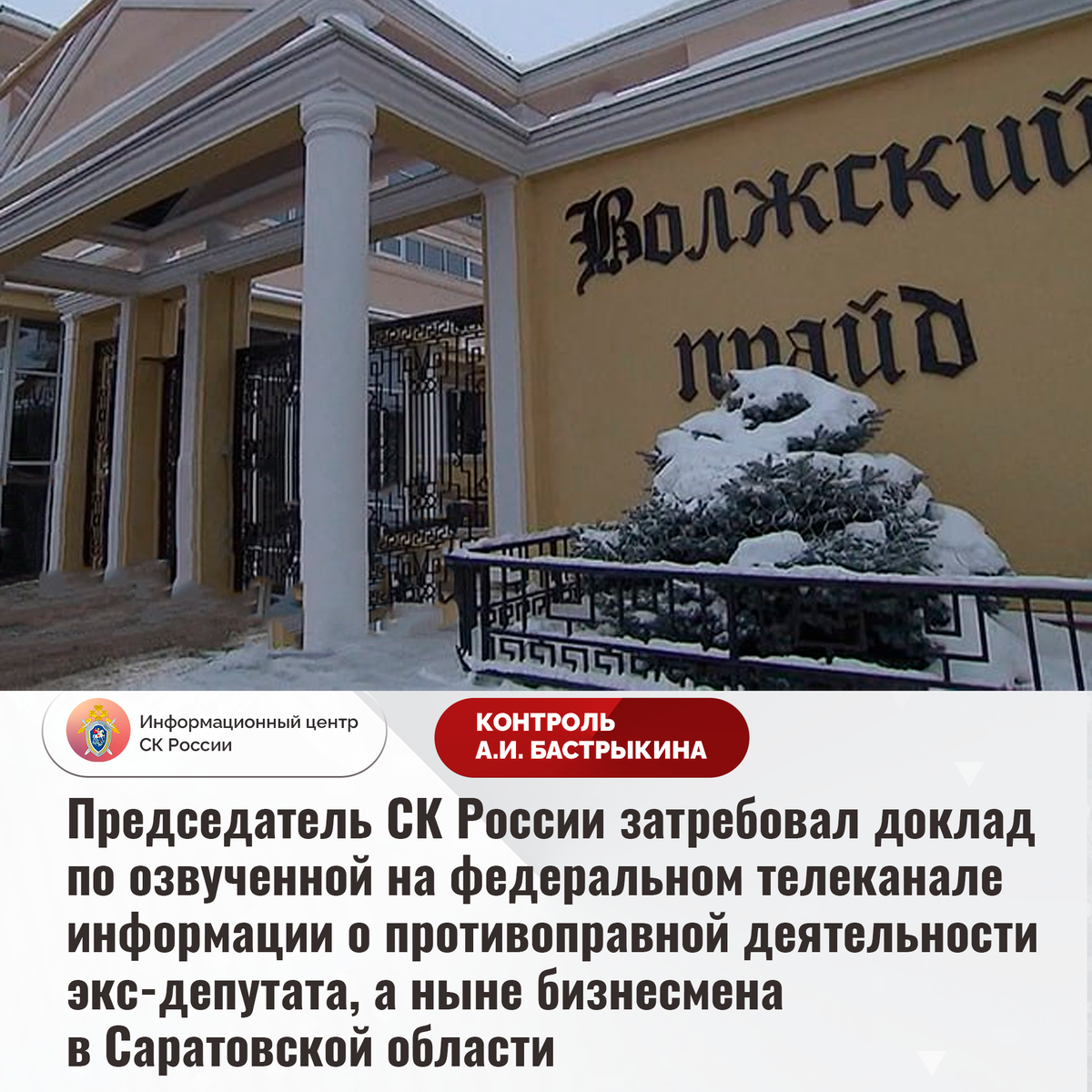 Председатель СК России затребовал доклад по озвученной на федеральном телеканале информации о противоправной деятельности экс-депутата, а ныне бизнесмена в Саратовской области В информационно-правой телепрограмме продолжает освещаться ситуация о нарушении прав жителей коттеджного поселка «Волжский прайд» Саратовской области. Обслуживающей организацией был ограничен въезд на территорию поселка для граждан на личных автомобилях, поскольку они отказались от услуг компании, которой принято решение об отключении водоснабжения и канализационной системы. Жители полагают, что данное решение принято местным бизнесменом, который ранее занимал выборную должность, и в настоящее время проживающим в поселке и имеющим связи с учредителем управляющей компании. При этом отмечается, что ранее фигурант мог быть причастен к организации нападения на корреспондента, занимавшегося журналистским расследованием особо тяжкого преступления в 2008 году, по которому бывший депутат допрашивался в качестве свидетеля