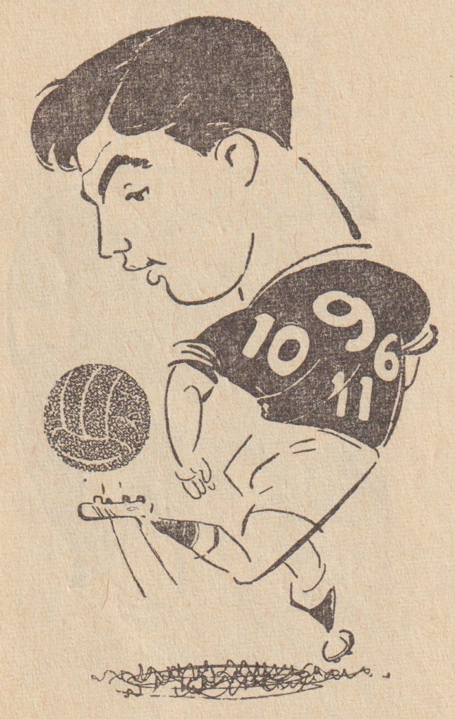 Шарж на В. Соловьёва. Многообразие номеров на футболке намекает на универсальность Соловьёва, его умение сыграть на любой из позиций нападения и средней линии.