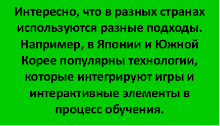 Привет! Сегодня поговорим о том, как современные технологии изменяют подход к изучению английского языка в разных уголках мира. Эта тема особенно актуальна, и я знаю, что у каждого из нас есть свой опыт и наблюдения в этой области. Давайте обсудим, как технологии сделали изучение английского языка более доступным. Раньше для того, чтобы учить язык, нам приходилось записываться на курсы или искать репетиторов. Теперь же благодаря интернету мы можем найти бесчисленное количество онлайн-курсов, приложений и даже видеоуроков. Это открывает двери для людей из самых разных стран, даже тех, где традиционные образовательные ресурсы ограничены. Интересно, что в разных странах используются разные подходы. Например, в Японии и Южной Корее популярны технологии, которые интегрируют игры и интерактивные элементы в процесс обучения. Это делает занятия более увлекательными и помогает поддерживать мотивацию. А что насчет вашего опыта? Использовали ли вы игры для изучения английского? Не стоит з