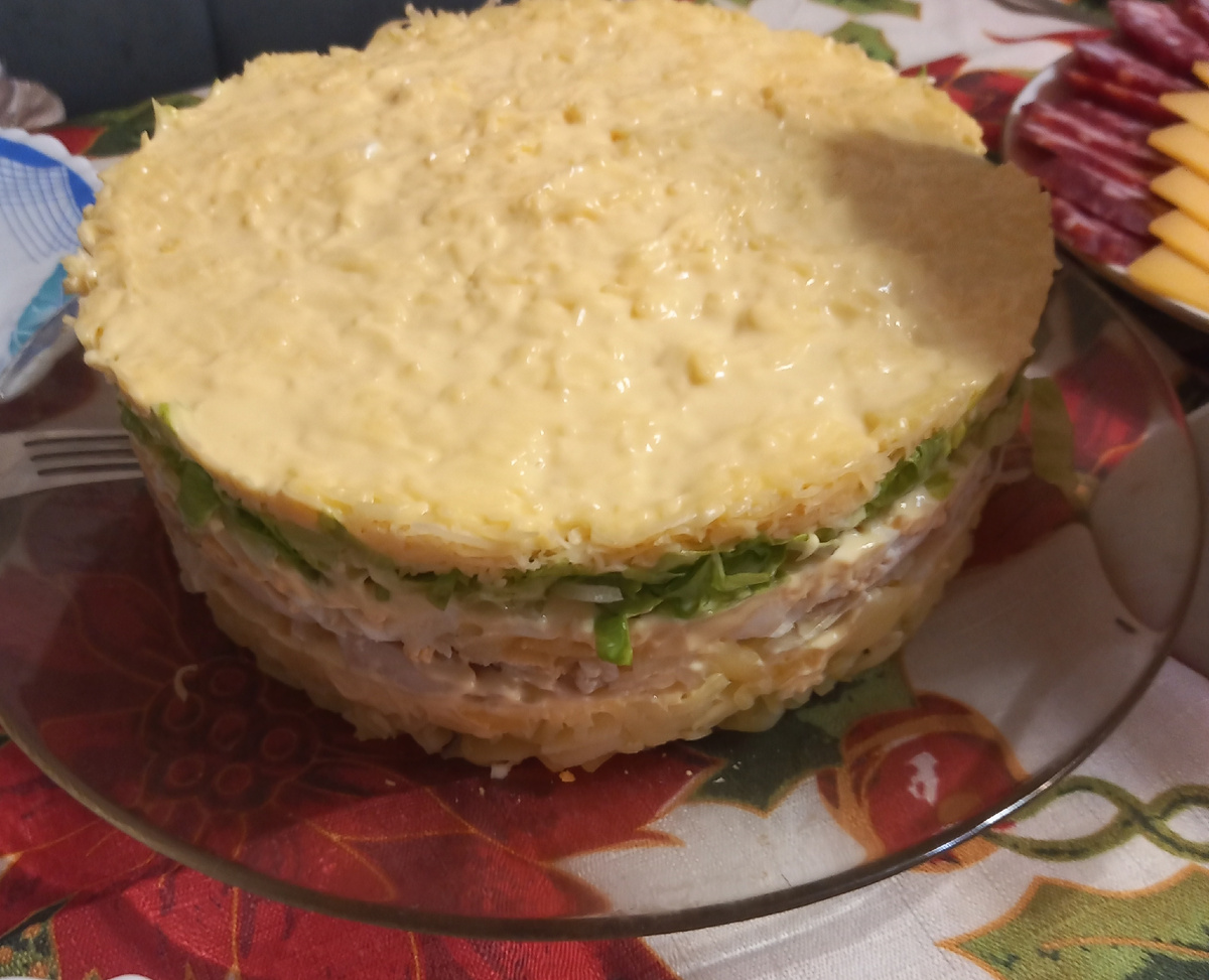 Добрый день! Год у нас начался "весело". В прошлом году Настасье зубы лечили, в этом похоже мужу будем лечить 🙈. В субботу приходили в гости друзья, во время застолья у мужа разболелся зуб. Промучился с зубной болью до вечера воскресенья и решил, что все таки зубы лечить нужно 😁Так что сегодня едем к стоматологу. Правда зуб у него уже перестал болеть и вылез флюс, он уже не хочет к врачу🤣🤣🤣Но я приготовила "аркан", так что в любом случае сегодня на прем. Готовила новый салат "Лебединый пух", он всем очень понравился. Теперь еще один салатик у меня в копилке рецептов. Держите рецепт 🤗 Для маринада: Маринуем лук. В миску кладём нарезанный полукольцами лук, сахара, соль, уксус яблочный и заливаем холодной водой. Маринуем 1 час. Натираем на крупной тёрке картофель и выкладываем на блюдо. Солим, перчим по вкусу и смазываем майонезом. Вторым слоем кладём лук, предварительно слив жидкость, и смазываем майонезом. Куриное отварное филе разбираем на волокна и выкладываем 3 слоем. Солим, п