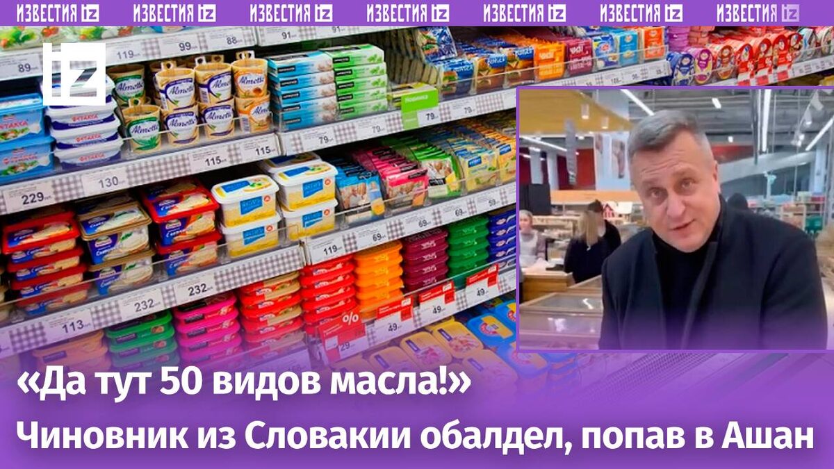 Словацкий чиновник Андрей Данко, попав в московский супермаркет, трогал продукты и выражал восхищение большим выбором Вице-спикер словацкого парламента Андрей Данко в рамках визита в Россию посетил московский супермаркет сети «Ашан». Видеозапись он опубликовал в соцсетях. На видео он ходит по супермаркету, приценивается к молоку, йогуртам, овощам, колбасам, сырам, трогает продукты и восхищается их наличием и разнообразием. По его словам, сливочное масло стоит в среднем €1,30-2,80, в магазинах около 50 видов сливочного масла и 40 видов молока. «Это, наверное, самый большой выбор плавленых сыров, который я когда-либо видел. Колбас, каких мы никогда не видели дома», — рассказал чиновник. Внимание вице-спикера парламента Словакии привлек шестиметровый холодильник с 50 видами разного масла. Политик взял в руку огромные помидоры стоимостью около 1,84 евро и молоко за 0,9 евро. Данко продемонстрировал в объектив большой йогурт, аналоги которого есть на его родине. Чиновник не прошел мимо со