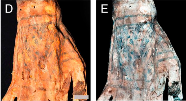 Исследователи использовали лазерный скан для изучения сложных татуировок, нанесенных на кожу древних перуанских мумий. Для этого применялся способ, который обычно практикуют для анализа тканей динозавров. Татуировки, о которых идет речь, были нанесены примерно 1,2 тыс. лет назад, поэтому краски выцвели, а также изменили вид из-за мумификации их владельцев. Обычное освещение (слева) и LSF (справа) Применяемый метод носит название лазерно-стимулированной флуоресценции (LSF), с помощью которого рисунок обретает почти первозданную четкость, демонстрируя скрытые в противном случае детали. Для сбора информации ученые провели сканы более 100 мумифицированных людей, на останках четверых были обнаружены особенно выдающиеся с точки зрения исполнения татуировки. Согласно предположениям исследователей, рисунки наносились с помощью тонкой иглы — из иголок кактуса либо выточенных из кости животных. Толщина некоторых линий составляет от 0,1 до 0,2 мм, что выделяет технику нанесения чернил от