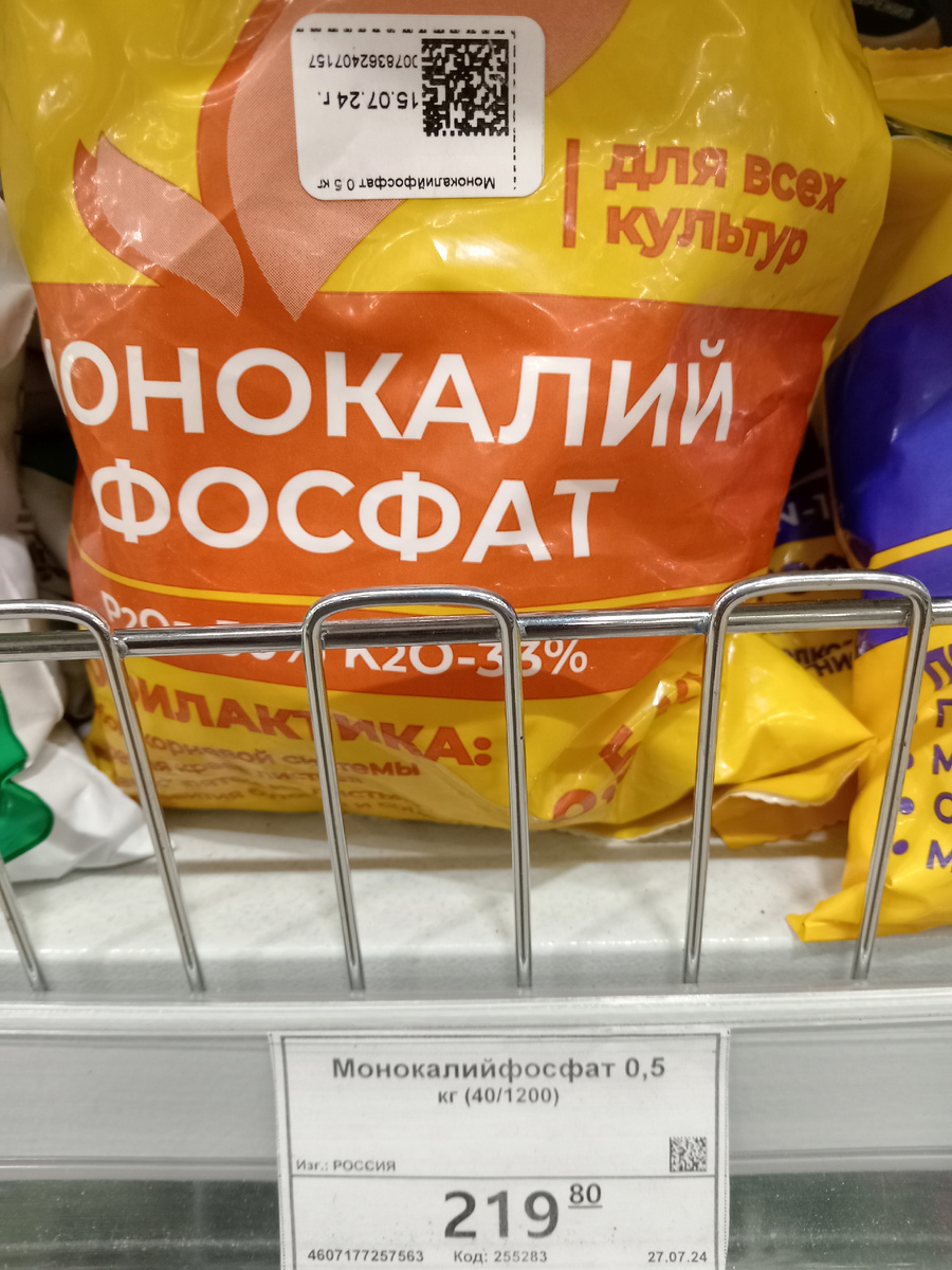 Монофосфат калия, это соль ортофосфорной кислоты ( KH2PO4), полностью растворимая в воде. Содержит 28% К и 23% Р, причем в той форме, в которой растения сразу готовы поглощать.