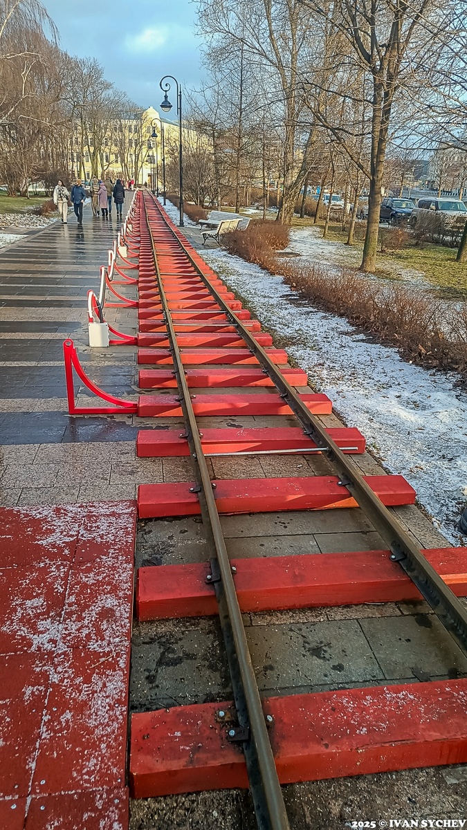 Начнем с небольшого фрагмента географии Москвы: Болотная площадь – это если не прям центр-центр, но очень центральное место. Можно сказать практически напротив Кремля, на острове, через речку от его красных стен. И увидеть там поезд – ну событие, наверное, практически невероятное. И все-таки возможное. Правда, поезд, конечно же, не совсем настоящий. Го то, как оно было со мной по порядку. 1. Уже не помню, что именно привело меня на Болотную в тот день (до этого я тут полгода точно не был, а то и более). Ну, вот шел я, шел, и почти споткнулся о рельсы, точнее даже о почти полноценный железнодорожный путь. Оказалось, что на зиму здесь почти полукилометровое железнодорожное кольцо положили. 2-3. И ходит по этой «узкоколейке» самый настоящий паровоз. Ну как настоящий – аттракцион, но все почти соответствует : состав из трех вагонов и паровоз. Не повезло с тем, что в тот день паровоз испытывал какие-то технические проблемы и его чинили. То есть бесплатного катания не было. И я до конца не п