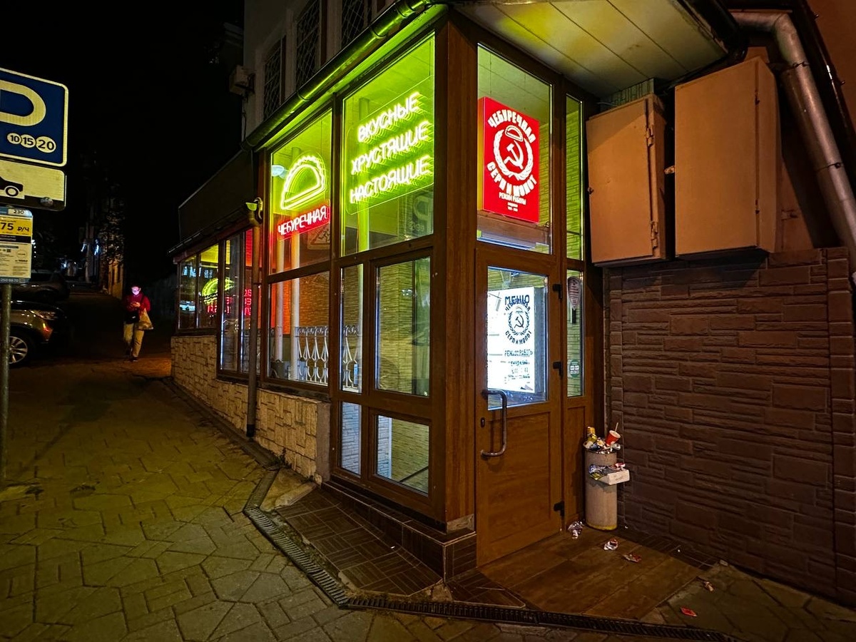 Прогуливаясь по одной из центральных улиц Владивостока, по адресу: ул. Светланская, д.37 (прямо на пересечении с улицей Уборевича) мы с друзьями обнаружили классическую чебуречную в советском стиле под названием «Серп и Молот».