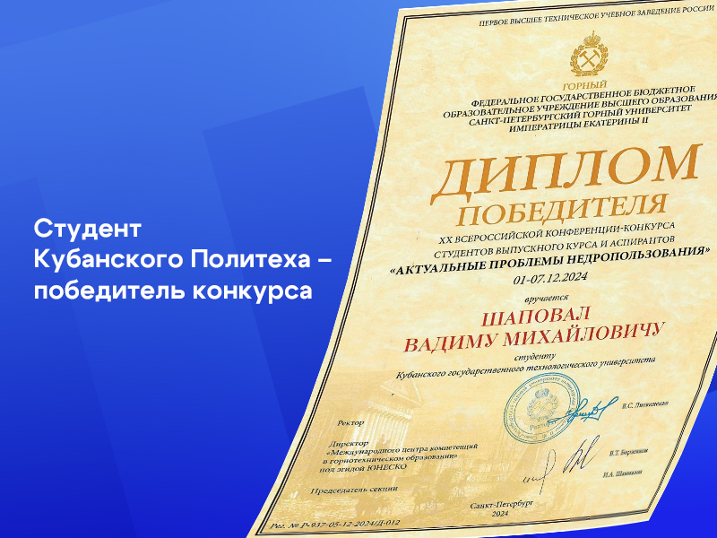 Студент Кубанского Политеха победил в XX Всероссийской конференции-конкурсе «Актуальные проблемы недропользования»