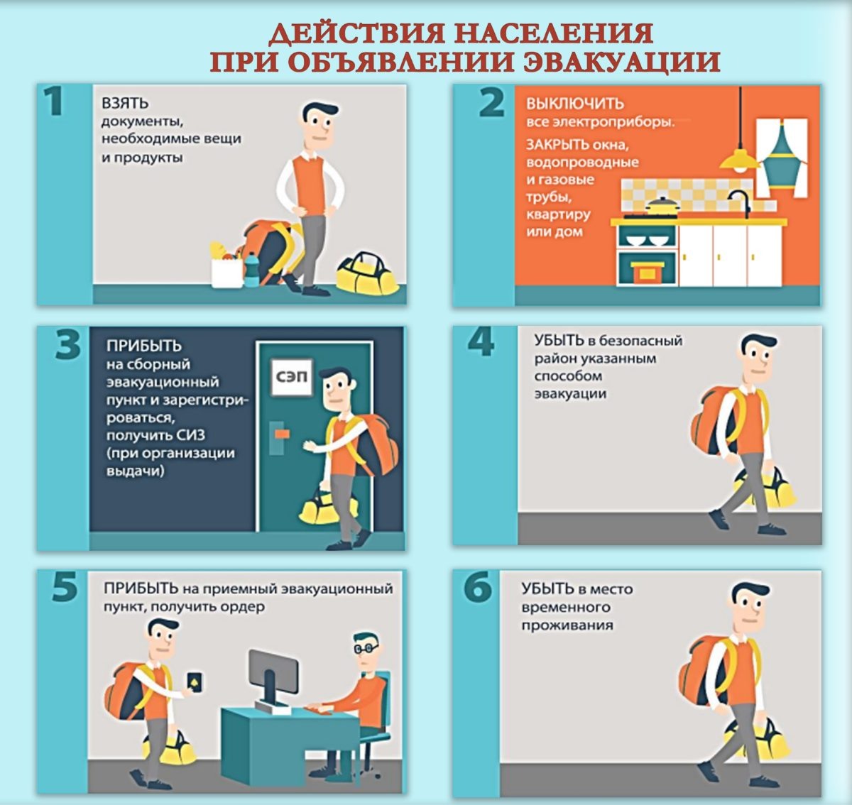 Эвакуация является одним из способов защиты населения в период стихийных бедствий, крупных промышленных аварий и катастроф. Эвакуация заключается в организованном выводе (вывозе) населения из крупных городов, других населенных пунктов и размещение его в безопасных районах, а также выводе (вывозе) населения из зон возможного катастрофического затопления, землетрясения, районов, которым угрожают селевые потоки, снежные заносы, крупные пожары и другие стихийные бедствия. О начале эвакуации населению объявляет местная администрация органов самоуправления. Получив извещение о начале эвакуации, каждый гражданин обязан: ► собрать все необходимые документы (паспорт, военный билет, документы об образовании и специальности, трудовую книжку, свидетельства о браке и рождении детей, страховые полисы), ► деньги, ► имеющиеся средства индивидуальной защиты (одежду и обувь, приспособленные для защиты кожи), ► аптечку индивидуальную и другие лекарства, индивидуальный противохимический пакет, пакет перев