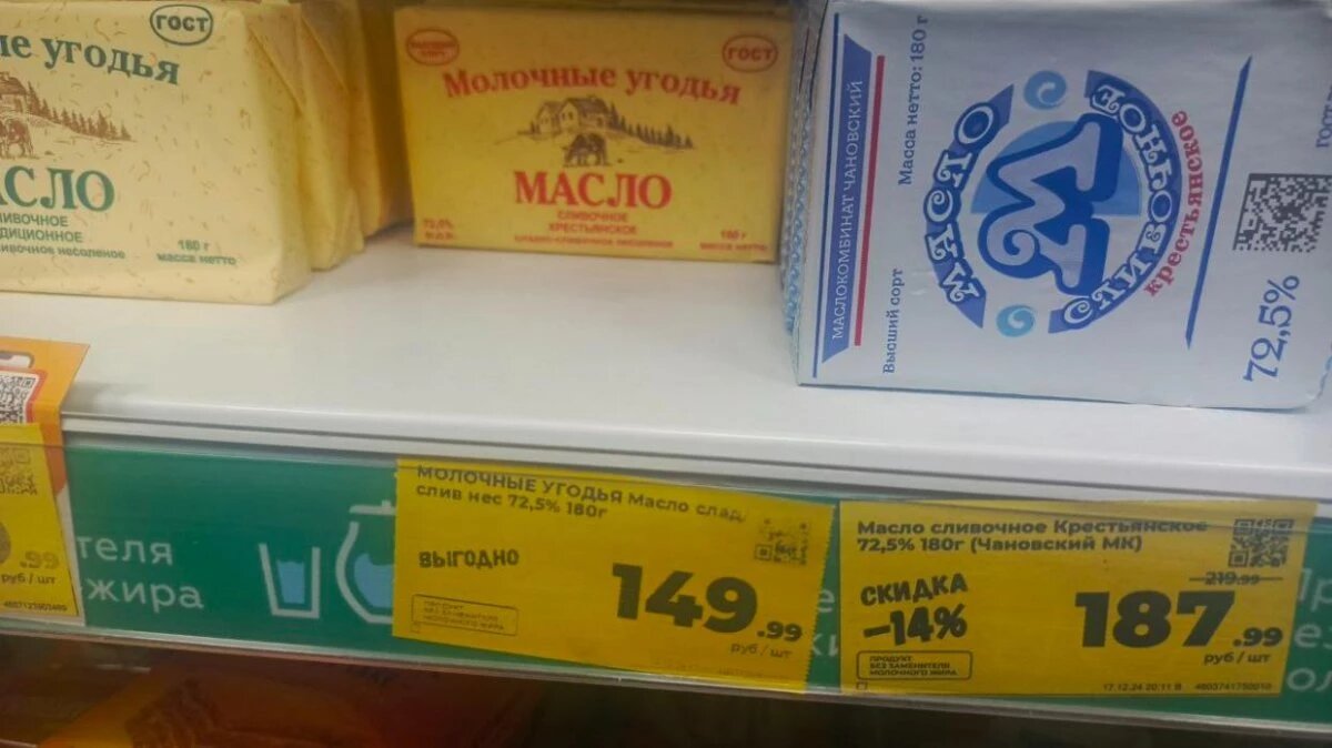 Однако, как стало известно Сибкрай.ru, несмотря на это, менее, чем за месяц, с 23 декабря 2024 года по 9 января 2025 года, в сетевом магазине «Мария-ра» в Новосибирске пачка самого дешевого сливочного масла весом 150 граммов и 72,5 % жирности подорожала на пять рублей – с 179,99 рублей до 184,99 рублей. За 18 дней рост составил почти 3 %. Учитывая тенденцию повышения цены на 3 %, к концу года рост может достигнуть 60 %.