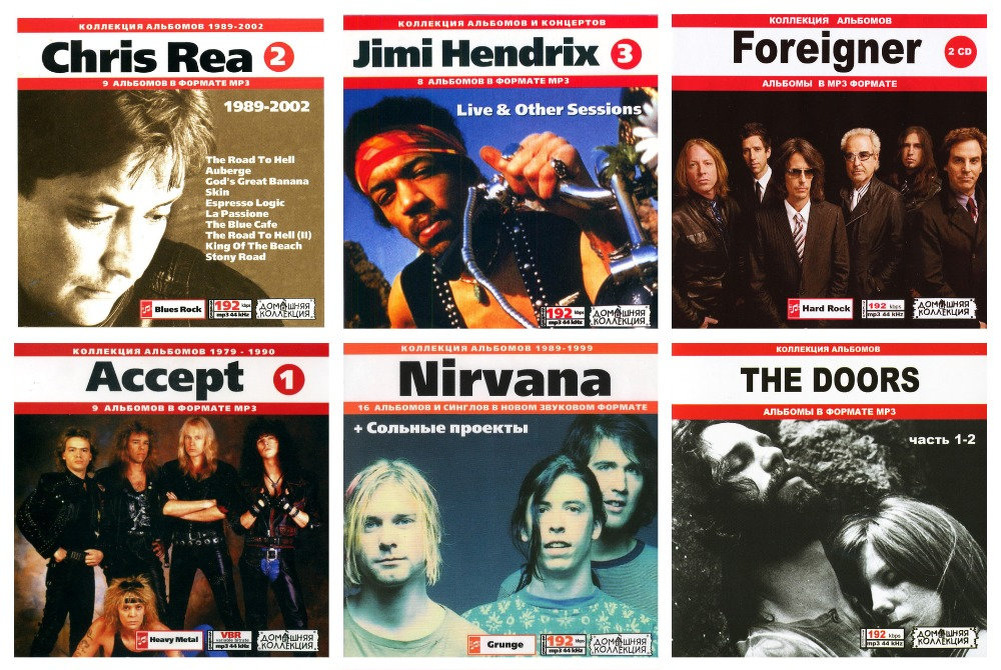 Интересно, кем был тот безвестный герой дизайна, который придумал оформление серии сборников mp3, которые заполонили лотки в 2000-е? Это была золотая эпоха формата mp3, когда меломаны на форумах до хрипоты спорили о преимуществах несжатых форматов над куцым битрейдом, превозносили винил и компакты в противовес повальной моде на CD-R'ы в формате «Вся дискография на одном диске». Слушатели попроще читали, ахали, соглашались, а сами покупали в ларьке или на развале очередную стопочку «Домашней коллекции». Да, качестве не ахти, зато все альбомы Пола Маккартни, Queen или Элтона Джона сразу! На этих дисках можно было найти не только номерные релизы, но и редкий материал — за смешные по тем временам деньги. Пиратский лейбл «Домашняя коллекция» разошёлся не на шутку. Число релизов составляет сотни. На болванках издавалось ВСЁ от поп-музыки и рока (обложки с красными полосочками), джаза и бардов до экстремального метала и индастриала (чёрные полосочки). Обложки лепились по одному принципу, фото