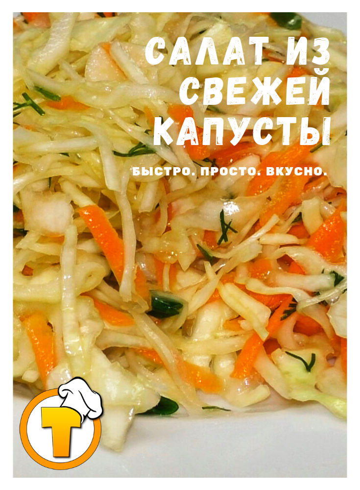 Вряд ли необходимо кому-нибудь доказывать, что овощи полезны абсолютно всем. Вот мы и решили приготовить очень простой, вкусный и полезный салат из свежей белокочанной капусты. Этот салат отлично подойдет для любого застолья и прекрасно дополнит загородный пикник. · Белокочанная капуста – 300 гр. · Морковь – 1 шт. · Уксус 9% - 1 ст.л. · Сахар – 1 ст.л. · Растительное масло – 2 ст.л. · Соль – по вкусу · Зеленый лук – по вкусу · Укроп – по вкусу В просторную емкость укладываем нашинкованную белокочанную капусту, натертую морковь, уксус, сахар, соль, зеленый лук, укроп, растительное масло и все перемешиваем. Даем немного настоятся салату. Приятного аппетита! Если Вам понравился рецепт - поставьте «класс» 👍, поделитесь им со своими друзьями или напишите комментарий. Мы с удовольствием обсудим этот рецепт с вами в комментариях. 🔔 Подпишитесь, чтобы не пропустить новые рецепты! 🔔 👀 На нашем канале Вы найдёте видео-рецепты по приготовлению вкусных и простых блюд, продукты для кото