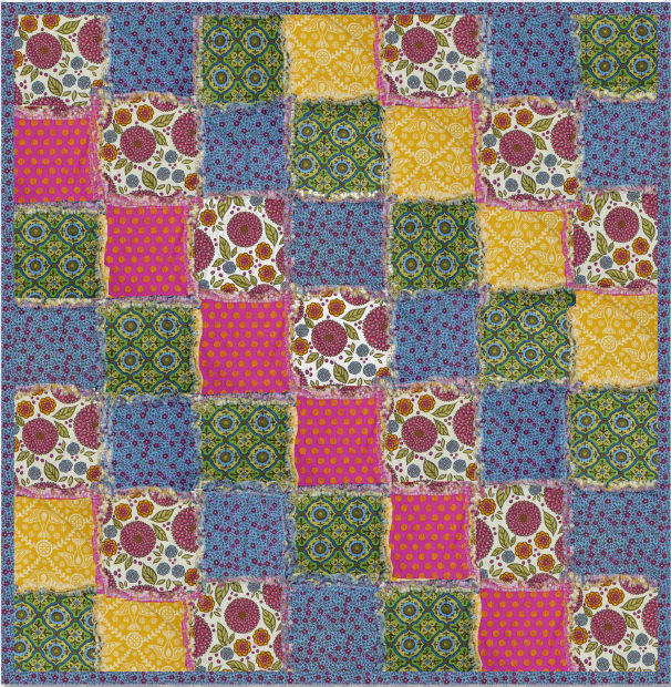 От компании Windhamfabrics, дизайнер Genevieve Gails www.windhamfabrics.com Готовый размер изделия: 42” x 42”. Квилт-потрепыш легко сшить – не надо наполнителя, не надо склеивать слои, нет стежки. Требуется только постирать и высушить изделие. Прочитайте все инструкции до раскроя изделия. Расход ткани: расход ткани указан исходя из ширины американского хлопка 42-44” или 110 см. Инструкции по раскрою: из всех тканей надо выкроить квадраты размером 7”. Ткань 1 цветочная – потребуется 1 1/2 ярда – выкроить 39 квадратов; Ткань 2 желтая - потребуется 7/8 ярда – выкроить 18 квадратов; Ткань 3 зеленая - потребуется 1 ярд – выкроить 36 квадратов; Ткань 4 розовая - потребуется 7/8 ярда – выкроить 18 квадратов; Ткань 5 голубая - потребуется 1 1/8 ярда – выкроить 36 квадратов и из нее же выкроить 5 полос шириной 2 1/4” для окантовки (на всю ширину ткани). 1 ярд равен 0.9144 метра. Т.е. расход каждой ткани около 1 метра, только ткани 1 потребуется 1,5 метра. Сборка деталей: 1. Сложить квад
