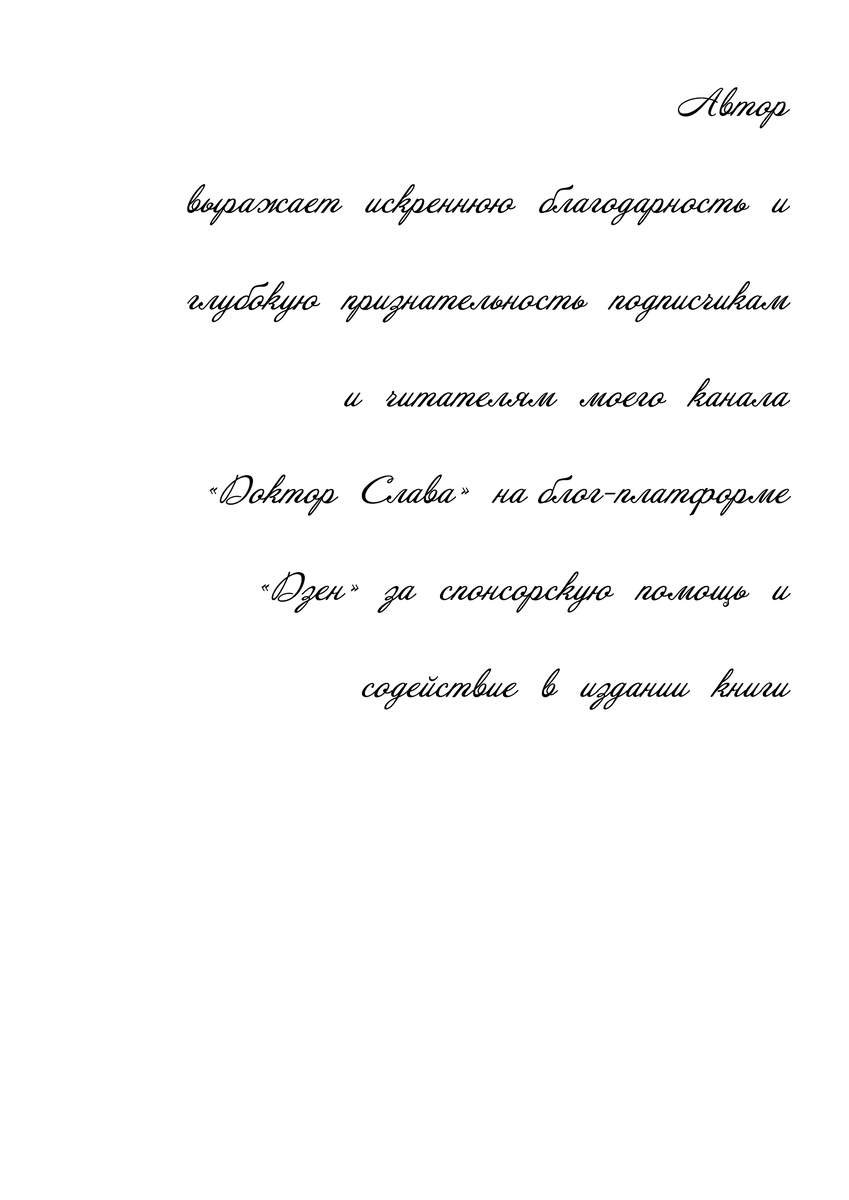 Уважаемые подписчики и читатели моего канала «Доктор Слава»! За последнее время произошли некоторые события, о которых я хотел бы поставить Вас в известность. 1. Мой перелом лучевой кости правой кисти срастается неправильно (со смещением), в связи с чем, даже после месячного нахождения в гипсе и ортезе, движения в суставе ограничены и он не функционирует должным образом. Мне придётся ложиться в травматологию, где кость сломают заново, шинируют спицами и вновь наложат гипс. Врачи говорят, что слишком рано начал трудовую деятельность. На всё про всё уйдёт не меньше месяца. Я уже не смогу, как раньше, трижды в неделю публиковать статьи, но буду держать «руку на пульсе», постараюсь по мере возможности быть «на плаву» и отвечать на Ваши вопросы и комментарии. 2. Книга почти готова и отдана в типографию на вёрстку. Я даже смог опубликовать её третью страницу – она перед Вами. Объём книги – чуть более 300 страниц. Собранных Вами средств по краудфантингу ориентировочно хватит на 100 экземпля
