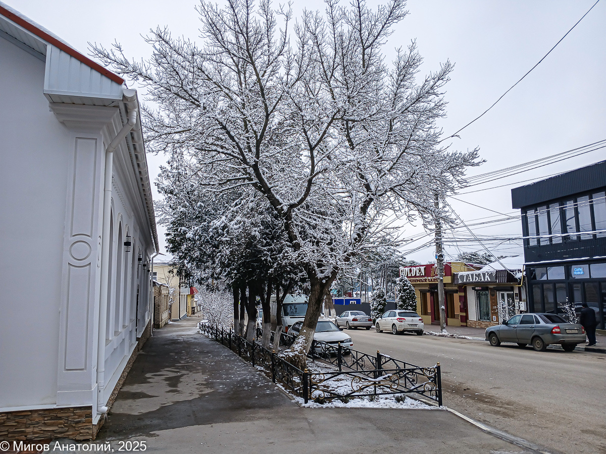 Фотоотчет с рынка я на этой неделе не делал, так как в воскресенье туда не ходил. Погода была не очень дружелюбной, вот я и отложил традиционный поход на неделю. А вместо того решил рассказать про магазинные цены на продукты в нашем городке Старый Крым. День по-настоящему зимний, новогодний. На деревьях снег лежит, но асфальт и тротуары сухие, чистые, никакого гололёда. Над горами сквозь пелену облаков пробивается мягкий свет, значит, там, над морем, солнечная погода. Я пошёл в ПУД - крымский сетевой супермаркет, который у нас стоит на улице Ленина в здании бывшего ресторана "Горный". Когда мы сюда приехали, ресторан ещё работал, но посетителями не мог похвастаться. Хотя, говорят, в советские времена кухня "Горного" славилась на весь Восточный Крым и поужинать сюда приезжали знающие толк люди из Феодосии и Коктебеля. Магазин небольшой, на 4 кассы. Но сколько я сюда ни захожу, работает всего один кассир. И тот часть времени занимается раскладкой товаров. Не так много покупателей сюда