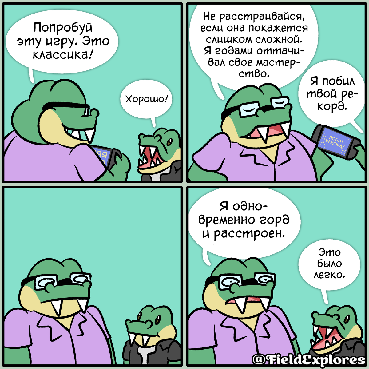 Комиксы серии, о которой пойдет речь сегодня, уже появлялись в этом блоге - прошлые материалы на эту тему можно найти по ссылкам в конце статьи. Мне серия про семейку крокодилов очень нравится - она милая и смешная, но порою и грустная. И не так давно автор серии выпустил четыре комикса, объясняющих одну важную деталь сюжета - почему в крокодильей семейке отсутствует мама. Этот сюжет получился очень трогательным, поэтому я решил в очередной раз написать об упомянутой серии и показать вам те самые комиксы. Надеюсь, что вам понравится! Серия комиксов с милым названием Grandma Field (англ. «Бабушкино поле») стартовала в конце 2022 года. Ее автор предпочитает оставаться анонимным и подписывается просто как Field. Изначально проект был посвящен видеоиграм - главными героями комиксов чаще всего становились персонажи таких популярных игровых серий, как Pokémon и Super Mario Bros. Но в начале 2024 года концепция Grandma Field изменилась: комикс стал рассказывать о мире антропоморфных животных,